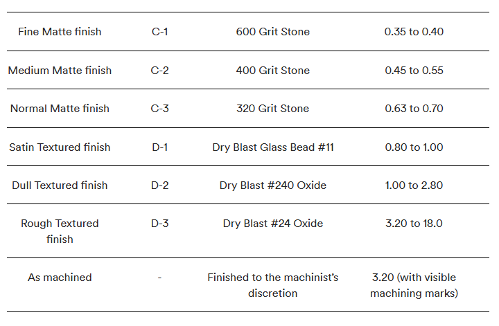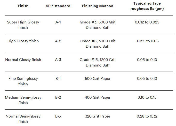 Esta tabla contiene todos los acabados de superficies de moldeo por inyección SPI que ofrecemos.